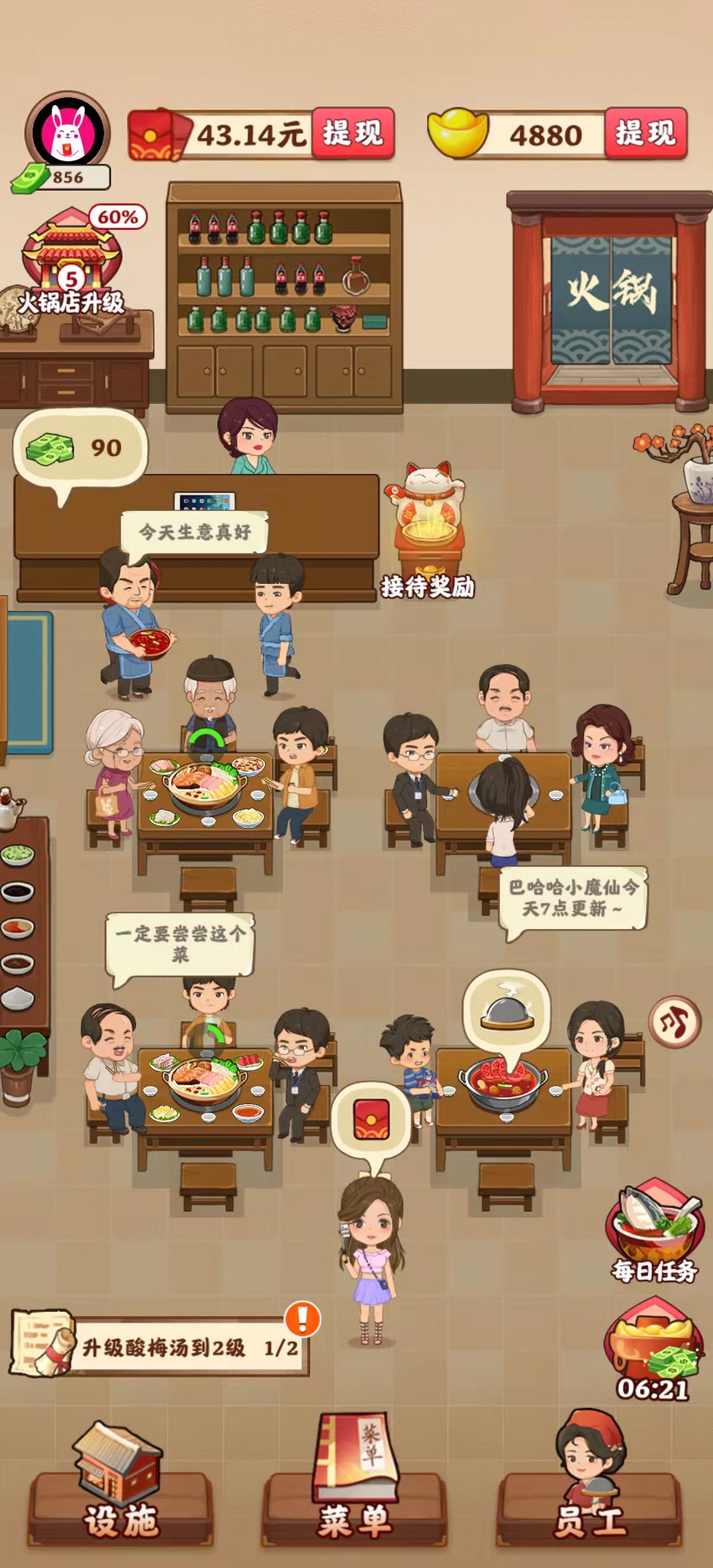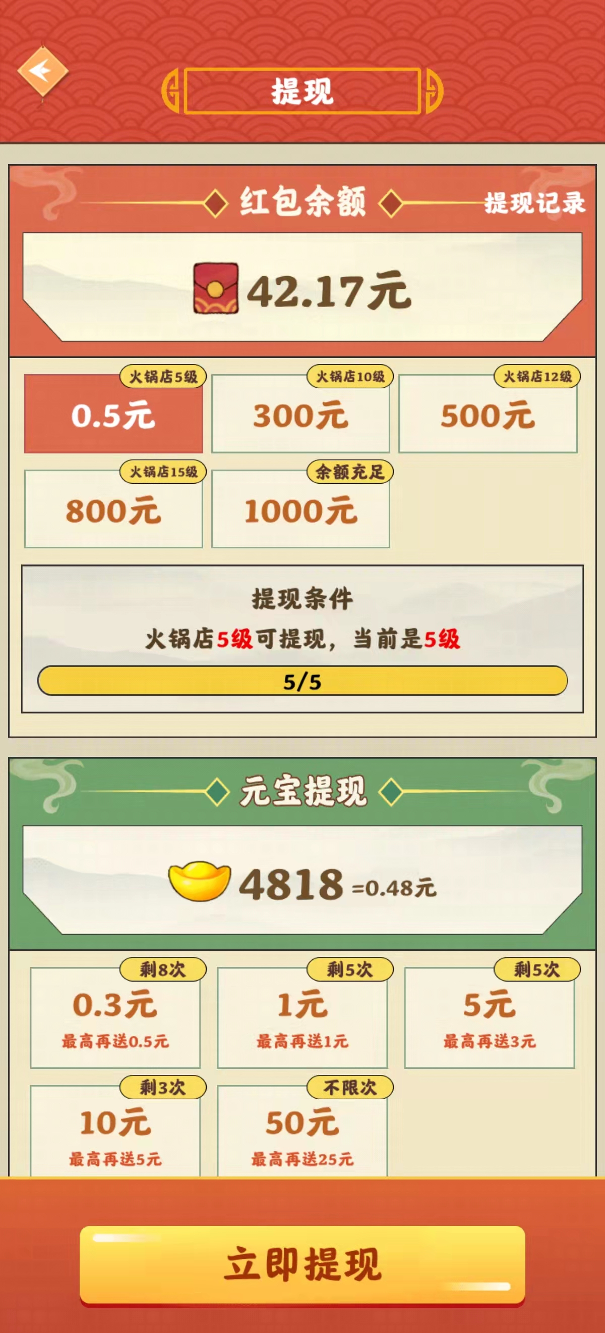 幸福火锅店APP是一款经营类红包小游戏,开局一个火锅店、四张桌子,依靠升级菜单、设备和员工,完成火锅店的不断升级并获得红包奖励。新用户登录后可以立即提现0.3元,后续火锅店达到指定等级可以多次提现。其中,元宝收益满0.3元可多次提现。