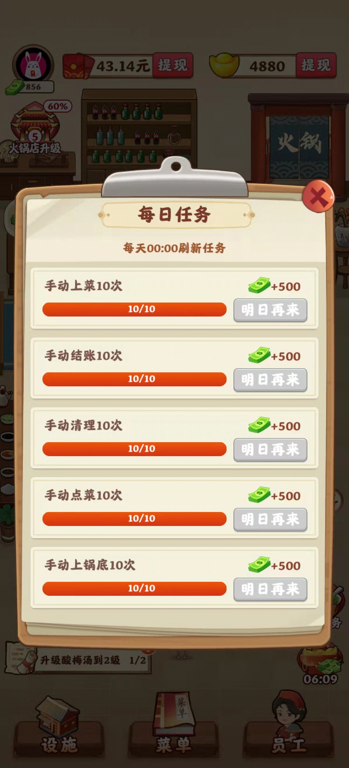 2、将火锅店升级到5级,可以再次提现0.5元;
